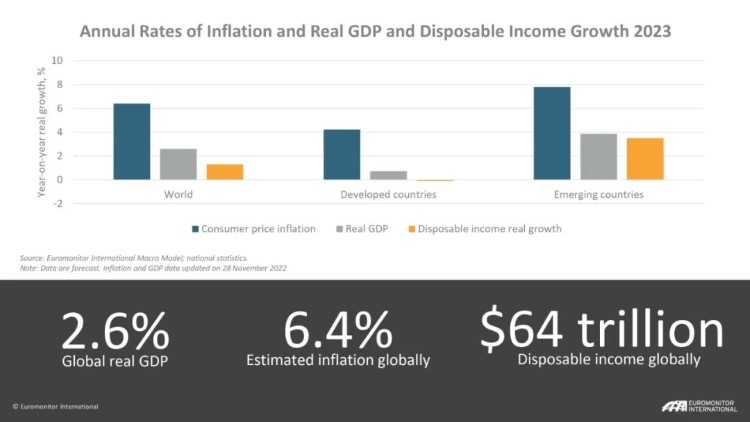 儘管疫情放開後,大量被壓抑的需求得以釋放,但是在高通脹、地緣政治危機、供應鏈等多重問題下,消費者信心不佳,歐睿國際預測2023年全球實際GDP增長率僅為2.6%,為2020年全球新冠爆發之後最低。