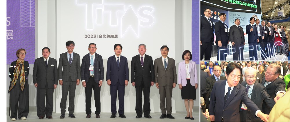 賴清德副總統蒞臨2023 TITAS,展現政府對紡織業的支持,與紡拓會郭紹儀董事長、徐旭東名譽董事長,以及總統府沈榮津資政、經濟部陳正祺次長、文化部王時思次長、國際貿易署江文若署長和產業技術司邱求慧司長,共同出席開幕典禮。 紡拓會董事長郭紹儀表示,台北紡織展是臺灣紡織業最重要的活動,雖然今年國際經濟環境不佳,以外銷為主力的臺灣紡織業面臨嚴峻挑戰,但本屆TITAS依舊維持相當的展出規模,實屬不易,計有381家廠商參展,攤位數達952個,更有超過71個國際品牌來台參與採購洽談會。