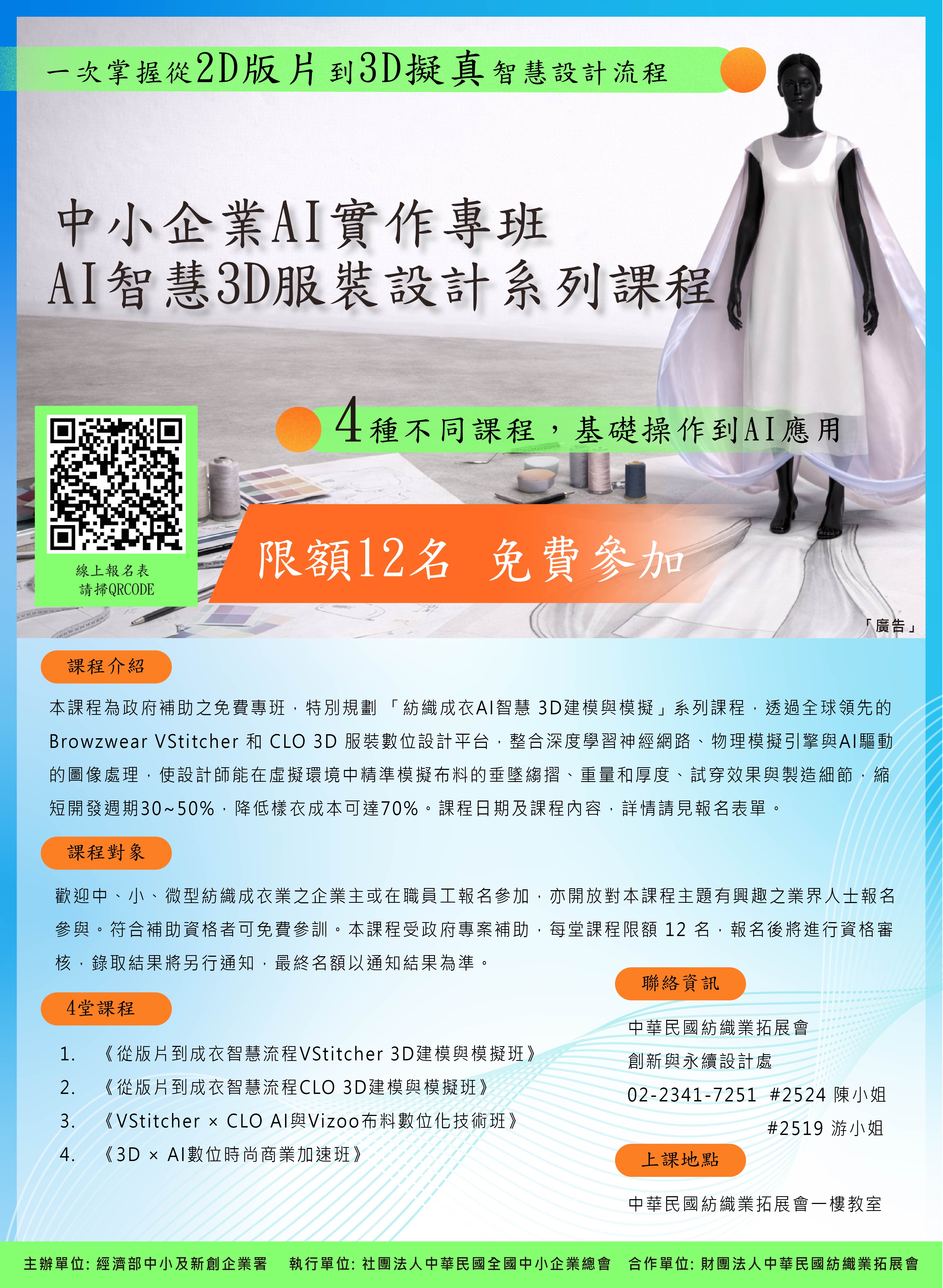 •請填寫線上GOOGLE表單報名👉【政府補助免費課程】AI智慧3D服裝設計系列課程,本課程補助生名額限12位,為確保資源有效運用,每人限參訓一次,錄取將另行發送通知。